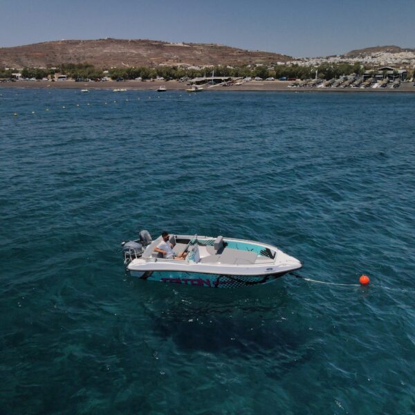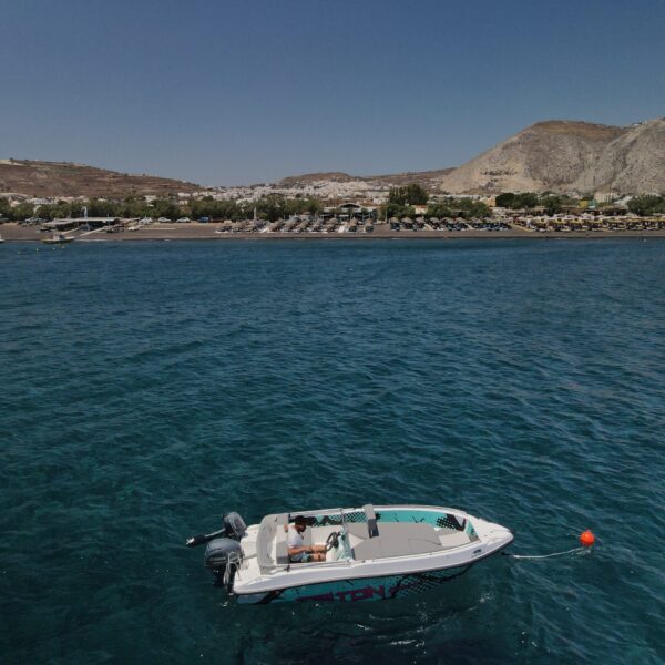 All our boats are equipped with a radio, a tent (bimini top), a cooler, bluetooth speakers and even WiFi to ensure you’ll have some of the most basic needs covered to have the most memorable day in Santorini.