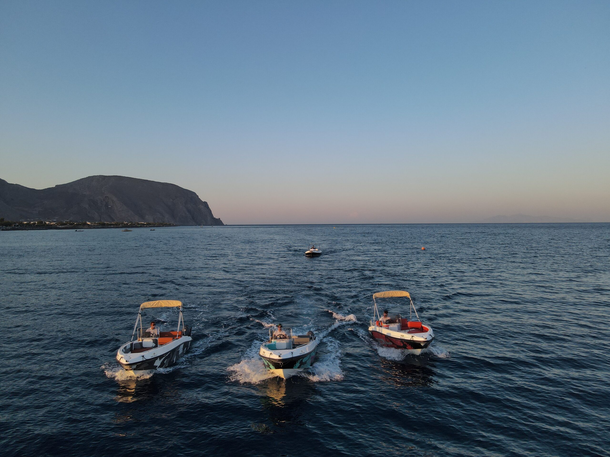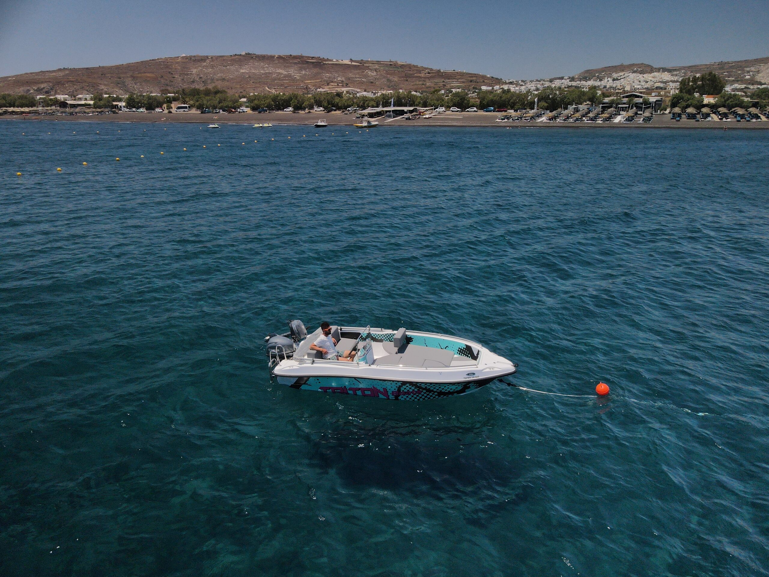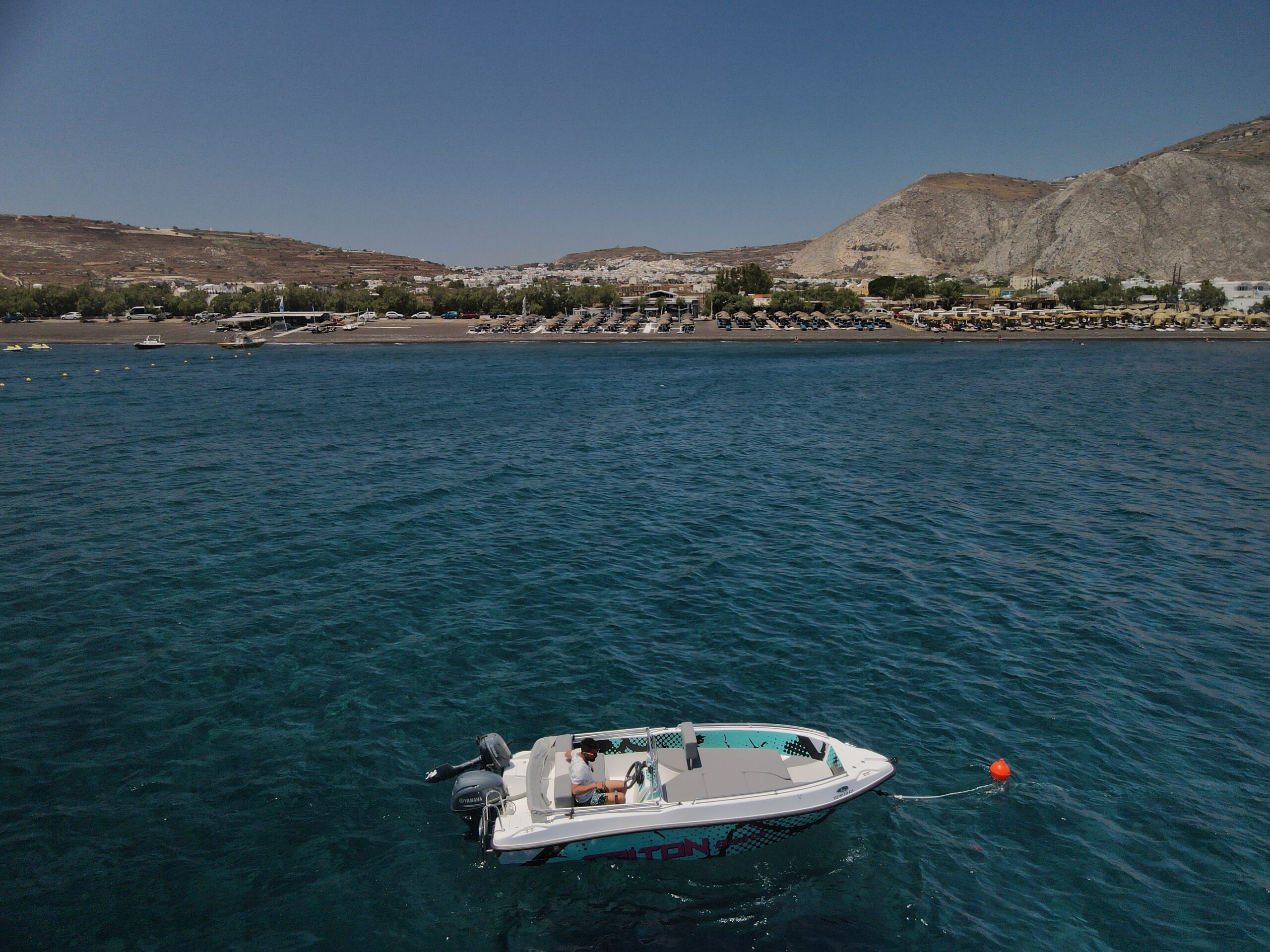 No license is needed to drive this type of boat and you can freely cruise around Santorini, the Volcanoes, Thirassia and Aspronisi.